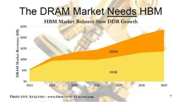 Jim Handy将实际和预测的 DRAM 市场(全球市场、价值)分为 DDR 和 HBM 类型。他预计 2024 年 DRAM 市场规模将略高于 1000 亿美元,其中大部分(略高于 85%)是 DDR DRAM。HBM DRAM 占比较小(略低于 15%)。预计 DDR 市场也将比 2023 年大幅增长。然而,预计 2025 年和 2026 年 DDR 市场将几乎没有增长。相反,HBM DRAM 预计将实现显著增长。2026 年 DRAM 市场规模将接近 1500 亿美元,其中 HBM DRAM 占比约为 31%,份额将翻一番。DDR DRAM 的份额将下降至约 69%。