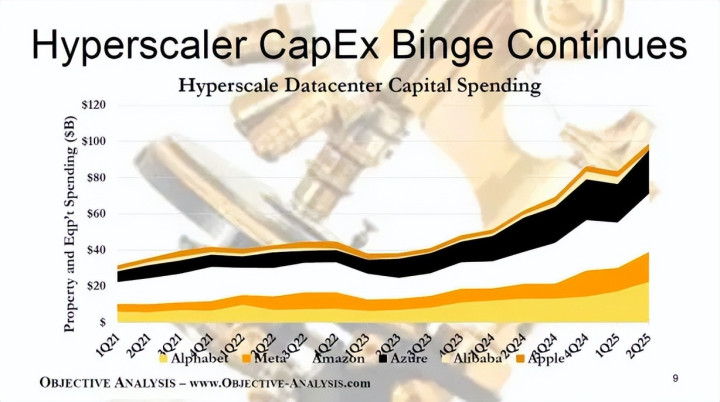 接下来是各大云服务公司在超大规模数据中心(DRAM 的主要应用领域)的投资额(有形固定资产)的季度趋势。涵盖的时间范围为四年半,从 2021 年第一季度到 2025 年第二季度。纳入的服务公司(或服务名称)包括 Alphabet(谷歌)、Meta、亚马逊(AWS)、Azure(微软)、阿里巴巴和苹果。