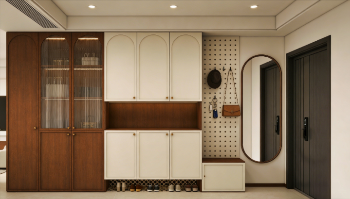入户区域采用“功能分区+视觉延伸”设计,一侧打造半通透玄关柜,胡桃木门板搭配米白色肤感柜门,底部镂空15cm用于放置常穿鞋,避免地面杂乱。另一侧墙面融合洞洞板与全身镜,洞洞板可悬挂包包、钥匙等小物件,兼具装饰与收纳功能,全身镜则瞬间拓宽入户视觉空间,与全屋定制柜色调形成呼应,进门即能感受到中古风的温润质感。地面选用600*1200微水泥地砖,与客餐厅地面通铺衔接,形成自然过渡的同时,便于日常清洁。