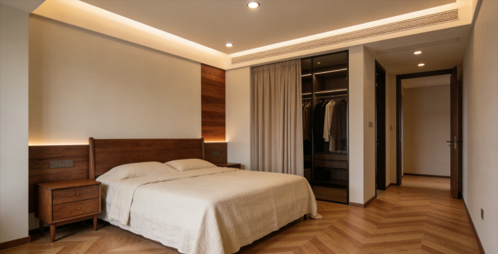 主卧沿用全屋中古基调,地面通铺鱼骨木纹砖,温润的自然纹理映衬岁月质感。床头背景墙以局部胡桃木饰面板点缀,搭配胡桃木床靠背与实木床头柜,软装选用米白色棉麻床品,中和木色的厚重,营造静谧舒适的睡眠氛围。卧室无主灯设计,采用双眼皮边吊+灯带+小筒灯的分层照明,暖光漫射整个空间,提升氛围感与舒适度。利用主卧深度优势,打造步入式衣帽间,帘子遮挡设计简洁利落,最大化利用空间收纳衣物。