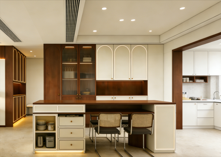 针对小户型收纳刚需,设计从入户延伸至阳台的一体化储物系统,整合鞋柜、餐边柜、电视柜与洗衣柜,胡桃木柜体与米白色柜门交替搭配,与微水泥地砖形成色彩呼应。餐区采用L型岛台餐桌一体设计,兼顾收纳、备餐与用餐功能,柜体融入骨骼线元素,增添复古优雅感,岛台下方预留充足抽屉,可收纳餐具、小家电等物品,实现美学与功能的平衡。厨房门口设计隐形门,与电视柜无缝衔接,让客餐厅视觉更整洁统一。