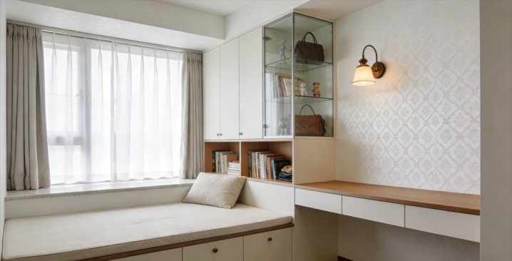 次卧以“多功能”为核心,靠飘窗打造榻榻米,满足储物与临时休憩需求,榻榻米尾部预留开放格与玻璃柜,开放格用于摆放书籍、摆件,玻璃柜收纳包包、杂物,避免整面柜体带来的压抑感。延伸柜体设计悬浮书桌,视觉上更轻盈,适配学习、办公需求,墙面通刷菱花白乳胶漆,搭配简约中古壁灯,保持空间通透的同时,呼应整体风格。