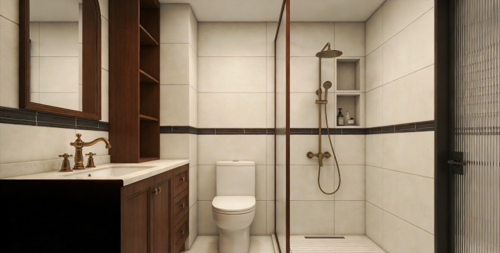4.6㎡的卫生间采用三分离设计,洗漱、如厕、淋浴互不干扰,最大化提升使用效率。摒弃传统台下储物柜,一侧打造顶天立地窄柜用于收纳洗漱用品,避免台下柜受潮漏水问题,柜面选用胡桃木色,与全屋风格统一。墙面铺贴浅色系瓷砖,局部以深色线条点缀,搭配黄铜材质水龙头,增添复古精致感,淋浴区预留壁龛,收纳沐浴用品,保持空间整洁有序。