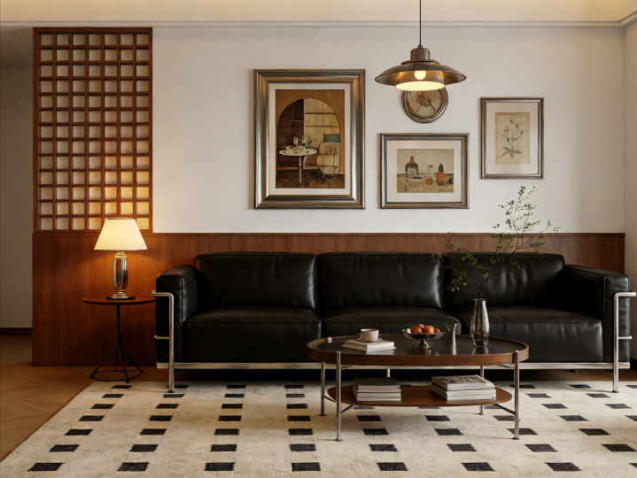 客餐厅作为核心公共区域,打破传统分区局限,以“收纳+氛围”为双重核心打造。客厅墙面通刷珍珠白乳胶漆,奠定明亮通透的基底,沙发背景墙无繁复造型,仅以胡桃木格栅做局部点缀,勾勒出中古风的层次感,搭配黑色皮质中古沙发与棋盘格羊毛地毯,复古韵味扑面而来。金属材质的台灯、挂画框作为点缀,在暖光(3000K)映衬下,注入现代精致感,避免木色过多带来的沉闷。