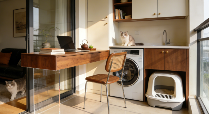 封窗后的阳台纳入客厅整体空间,一侧定制胡桃木与透明亚克力结合的悬浮书桌,轻盈的材质削弱了实木的厚重感,远观仿佛悬浮于空中,既适配中古风调性,又兼具现代简约感。业主可在此专注办公,闲暇时泡一壶茶、捧一本书,享受时光流淌的惬意。另一侧整合洗衣柜与猫砂盆收纳区(适配业主养宠需求),预留通风口,让猫砂盆“隐身”的同时,保证区域干燥无异味,实现办公、家政与宠物需求的和谐共存。