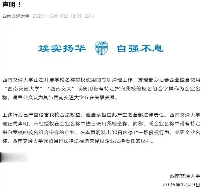 2025年12月10日,西南交通大学发表声明称,该校正在开展学校名称授权使用的专项清理工作,发现部分社会企业擅自使用“西南交通大学”“西南交大”或使用带有特定指向该校的校名组合字样作为企业名称,误导公众认为其与西南交通大学存在关联关系。