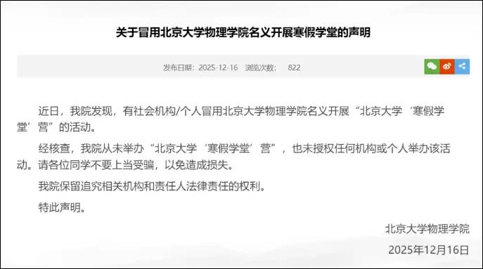 2025年12月16日,北京大学物理学院发表声明称,有社会机构、个人冒用北京大学物理学院名义开展“北京大学‘寒假学堂’营”的活动。北京大学物理学院从未举办“北京大学‘寒假学堂’营”,也未授权任何机构或个人举办该活动。