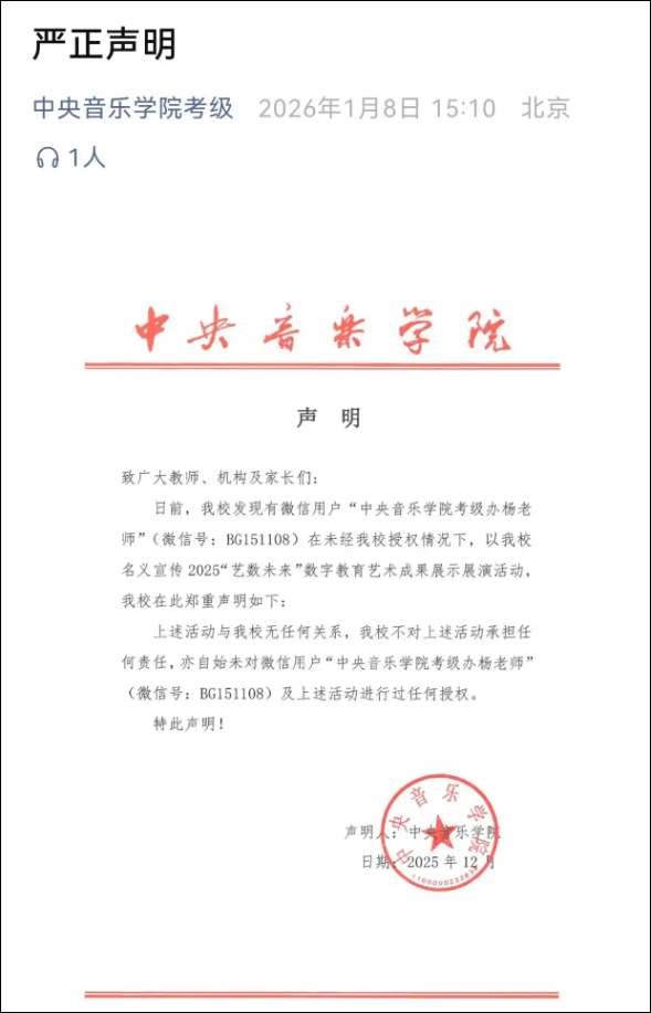 近日,一位名为“中央音乐学院考级办杨老师”的网友,在网络上宣传2025“艺数未来”数字教育艺术成果展示展演活动,引发关注。1月8日,中央音乐学院紧急发声,自始未对此人及上述活动进行过任何授权。
