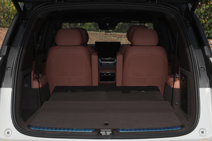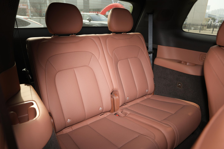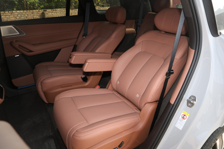 空间表现是家庭SUV的核心诉求,腾势N8L凭借5.2米车长与3075mm轴距,将空间利用率做到较高水平。2+2+2六座布局彻底告别“第三排应急论”,身高175cm的成年人坐进第三排,腿部仍有一拳余量,靠背支持前后100毫米滑移与121度角度调节,搭配独立空调出风口与座椅加热,即便长途乘坐也无明显局促感。277mm宽的中央过道,方便老人孩子进出,相比理想L8的窄过道更具实用性。